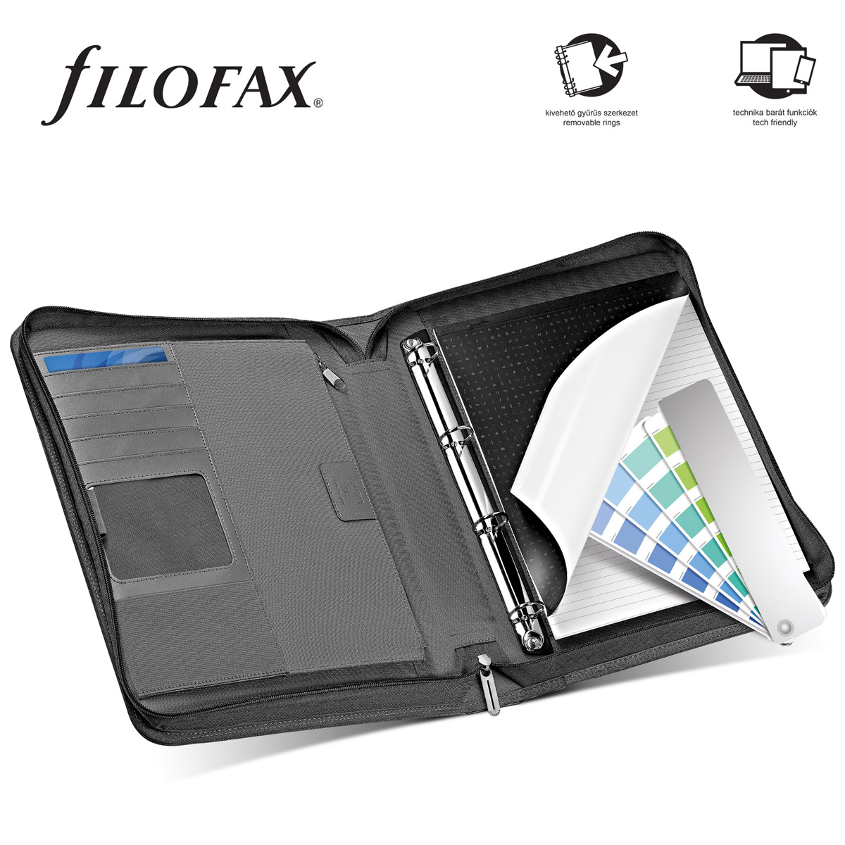 Strapabíró Microfiber és bőrhatású műbőr anyagok ízléses kombinációjával készült mappák mindennapos használatra, irodában és az állítható magasságú fogantyúnak köszönhetően, az irodán kívül is. A Microfiber mappák tablet-tartó zsebbel és kivehető gyűrűs szerkezettel készülnek. Az A4 méretű jegyzettömb kényelmes jegyzetelési lehetőséget nyújt.